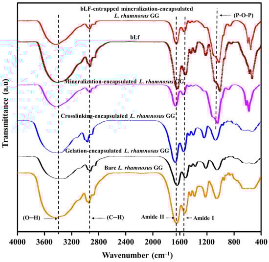 The entrapment of bLf on the surface of encapsulated L. rhamnosus GG cells and the possible chemical interactions between the drug molecules and the chemical functional groups on the modified cell surface were determined by FTIR, and the results are shown in Figure 6. The FTIR spectrum of bare L. rhamnosus GG cells showed characteristic absorption bands for the hydroxyl (O–H) group at 3394 cm−1. The typical peaks for amide I and amide II functional groups at 1510 cm−1 and 1992 cm−1, respectively, appeared in the FTIR spectrum of L. rhamnosus GG cells due to the presence of proteins in the cell membrane. The gelation-encapsulated L. rhamnosus GG cells showed a decreased intensity and a slight shift of the O–H peaks to a lower wavelength, indicating a chemical interaction of sodium ions with the functional groups on the cell membrane and formation of a gelation surface [41]. However, the transformation of gelation-encapsulated cells to crosslinking-encapsulated cells resulted in increased intensity and a slight shift of the O–H group to a higher wavelength, indicating the formation of a chelating structure between the hydroxyl and carboxylate functional groups of alginate and Ca2+ ions. This chemical interaction further strengthens the hydrogen bonding on the cell surface [12,42,43]. The mineralization of cells was chemically verified by the presence of specific peaks at 1033 cm−1 and 1030 cm−1 for phosphate group single bonds, which could be ascribed to the asymmetric stretching vibration of the P–O–P functional group and symmetric stretching of the non-bridging oxygen in the Q0 tetrahedron [44]. Moreover, the gelation-encapsulated, crosslinking-encapsulated, and mineralization-encapsulated L. rhamnosus GG cells showed peaks at 2927 cm−1, 2928 cm−1, and 2925 cm−1, respectively, for the CH2 group of sodium alginate, while the peaks for the amide Iα helical protein structure for the carbonyl (C=O) group appeared at 1655 cm−1 in the differently modified cells.