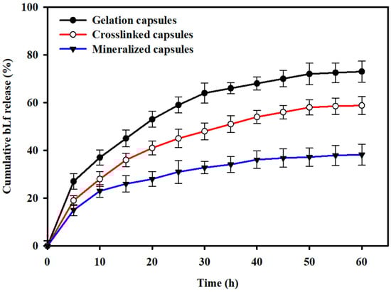 The in vitro release profile of bLf from the gelation-encapsulated, crosslinking-encapsulated, and mineralization-encapsulated L. rhamnosus GG cells is shown in Figure 7. The results show that the gelation-encapsulated, crosslinking-encapsulated, and mineralization-encapsulated L. rhamnosus GG cells presented a burst release during the initial 9 h and released approximately 36.2%, 28.7%, and 21.4% of the total loaded drug content, respectively. After the initial burst release, a sustained drug release was observed that leveled off after 60 h and showed cumulative drug release of 74.2%, 58.7%, and 37.5% for the gelation-encapsulated, crosslinking-encapsulated, and mineralization-encapsulated L. rhamnosus GG cells, respectively.