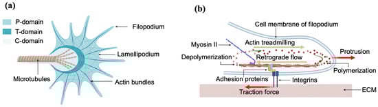 Cells exert physical forces on the surrounding environment (neighboring cells, growth substrate, ECM tracks). Various cell functions such as cell signaling, proliferation, ion channel regulation, migration, morphogenesis, ECM remodeling and cell–cell interactions are also regulated in many cases by biomechanical interactions [9,10,11]. These cellular forces can be generated outside of the cell, referred to as exogenous, or generated inside of the cell and then transmitted out, known as endogenous [23]. The tangential force exerted by cells on the ECM substrate is called the traction force, and is generated inside the cell (endogenous). These endogenous traction forces are generated by the collective work of stress fibers, actin filaments, myosin, and other proteins that helps to anchor the cell to the surrounding ECM, and then transmitted to the ECM substrate through focal adhesions [1,2,3]. In the case of neurons, the generation of traction forces occurs when the growth cone adheres to the substrate through adhesion proteins and integrin-containing focal adhesions (Figure 1b). These molecules control the polymerization of actin filaments, which in turn push forward the leading end of the P domain of the growth cone (Figure 1). We will describe this process in more detail in Section 4.