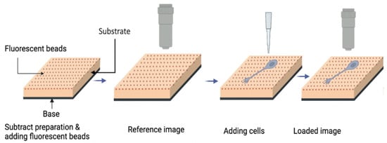 TFM initially emerged as a powerful microscopic technique for measuring the force generated by a single cell in two dimensions (2D). However, it was developed over time to include multicellular systems and 3-dimensional (3D) substrates. TFM is also used to measure cellular health since the movement of the cells is primarily governed by biomechanical interactions [25,26]. A growing body of research explores mechanobiological and cellular mechano-transduction mechanisms by studying the interaction between the cells and ECM through traction force. For example, traction forces exerted by 3T3 fibroblasts during steady locomotion was mapped by Dembo and Wang in reference [37]. The authors found that the propulsive thrust for fibroblast locomotion is around 200 nN [37]. Razafiarison et al. [38] showed that surface energy of soft biomaterials can affect the receptor recruitment and signaling of human mesenchymal stem cell cells by using TFM. It was found that the traction forces generated by the different types of cancer cells are different from each other and they can be distinguished from the normal cells. Thus, TFM has become a very important characterization technique for identifying various types of cancer cells, as summarized in a recent paper by Zancla et al. [39].