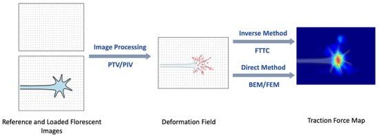 Several types of image processing methods, including particle tracking/image velocimetry (PTV/PIV), correlation-based PTV [32], and feature-based registration [33], are typically used to determine the displacement field. After obtaining the displacement field the traction force can be calculated using a variety of computational methods [23,26,27,28,29,30,31,32,33,34,35,36,37,38,39]. Since the cells exert distributions of forces rather than discrete traction forces, the TFM image is interpreted as traction stress, i.e., force per unit area. The actual traction force can be estimated by integrated the stress over a given contact area [27,28,29,30,31,32,33,34,35]. The computational approaches can be divided into the direct and inverse methods (Figure 3). In the direct method, the traction force is calculated directly from the displacement field by differentiation and transformation between strain and stress. Finite element methods (FEM) [33,34] and boundary element calculations (BEM) [32,35] are the two most used direct methods for calculating the traction force. The inverse method minimizes the difference between the experimental and estimated displacement fields. Fourier Transform Traction Cytometry (FTTC) is the most commonly used inverse method for the reconstruction of traction forces [28,32,33,34,35]. FTTC was introduced by Butler et al. [32] and is based on modeling the deformation field using the linear theory of elasticity, which leads to a Fredholm-type integral equation [32,36]. In FTTC the spatial displacement field is discretized using a uniform rectangular grid, that covers the whole image. The traction force field is then calculated as a set of plane waves using the Boussinesq Green function [32,33,34,35].