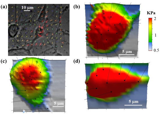 In addition to TFM experiments, we perform simultaneous high-resolution AFM measurements of individual neuronal cells. Figure 7 shows an example of these combined TFM/AFM measurements. Figure 7a shows a TFM image of neuronal cells cultured on a PAA substrate with Young’s modulus ES = 470 Pa. The arrows show the displacement field . Figure 7b–d show three-dimensional (3D) AFM elasticity maps of single neurons. The AFM measurements enable us to determine the distribution of elastic modulus, cell morphology and volume. In this way changes in cell stiffness and cell deformations measured by AFM can be directly related to forces exerted by the cell on the growth surface, which are simultaneously measured by TFM. The arrows in Figure 7b–d indicate the position of focal adhesion points of the cell. The AFM data (Figure 7b–d) demonstrate that neurons that exert traction forces on the substrate have higher-than-average values of the cellular elastic modulus, i.e., in the range 1–2 kPa.
