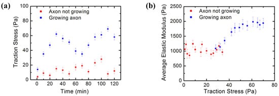 Traction stresses and forces are determined from the measured bead displacement on the PAA substrate using Equations (1)–(4) (Section 2.3) and a custom MATLAB routine [34]. Figure 8a shows an example of the variation of the traction stress in time for two different cells: a cell with an active growing axon (blue data points), and a cell where the axon is not growing (red data points). The measurements were performed every 10 min for a total of 2 h, starting at t = 32 h after cell culture.