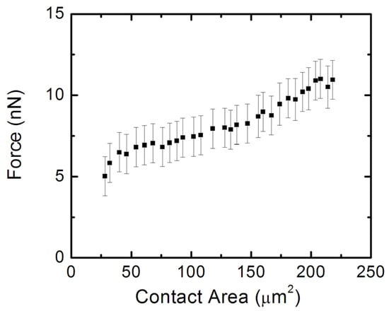 Figure 9 shows the variation in the traction force (obtained from TFM) with the cell–surface contact area (measured by AFM). These measurements are performed for several neurons (N = 30 cells) that display axonal growth. The data in Figure 9 show a net increase in the traction force with increasing contact area, consistent with a contact guidance mechanism for axonal growth. Neurons generate traction forces as they extend, and axonal growth proceeds by the formation of adhesion points between the cell and the substrate.