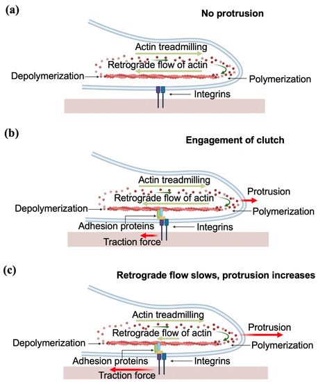 The molecular clutch connects the flow of F-actin and the integrins of the ECM. During protrusion, the F-actin adheres to the substrate through focal adhesions (clutch molecules), which in turn causes the attenuation of the retrograde flow of F-actin (Figure 10b). The momentum of F-actin retrograde flow is transmitted to the substrate through the clutch, thus generating the traction force on the substrate. At the same time, the F-actin treadmilling at the leading end pushes the membrane forwards, resulting in the advancement of the growth cone through a Brownian ratchet mechanism [46,47] (Figure 10c). The whole process is controlled by the contractility of the motor protein myosin II [46].