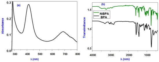 (a) UV-vis absorption spectrum of NiBPA; (b) FT-IR spectra of BPA and NiBPA.