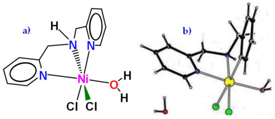 Polypyridyl ligands are very interesting in biological and materials science [22,23,24,25,26,27,28,29]. Tridentate ligands with two identical terminal coordination sites, such as bis(2-picolyl)amine (BPA), are being studied as building blocks in a variety of areas, including chemosensors, catalysts, and biomedicinal applications [30,31,32,33,34,35]. BPA and its secondary nitrogen-substituted derivatives develop stronger complexes with nickel(II), showing the coordination versatility of such ligands and their significance in a variety of biological, catalytic, and magnetic aspects [36,37,38,39,40]. Numerous authors have also explored the use of Ni(II) complexes based on BPA for the cleavage of DNA or RNA [14]. On the other hand, drug interactions at the protein binding level have a significant impact on the apparent distribution volume and elimination rate. As a result, the interactions of metal complexes with serum albumins have received a great deal of attention in the scientific community, with researchers focusing on antitumor, metallopharmaceutical, pharmacokinetics, and structure–activity relationships [41].