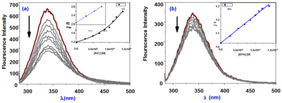 Figure 4 shows that at low concentrations, both BPA and NiBPA have linear Stern–Volmer plots, indicating that only dynamic or static quenching is involved in these quenching processes. The KSV values for BPA and NiBPA were found to be 0.21 × 104 and 0.7 × 104 M−1, respectively, indicating that NiBPA has a higher strong binding than the BPA ligand. The Kq value is much higher than the 2 × 1010 M−1s−1 maximum scatters collision quenching constant of quenchers with BSA (Kq = Ksv/τ0), where KSV is the Stern–Volmer constant and τ0 is the average lifetime of the BSA in the absence of the quencher (τ0 = 10 ns). This supports the idea of a static quenching mechanism. Complex NiBPA exhibits an upward curvature of the Stern–Volmer plot at higher concentrations, and this deviation from the linearity of the Stern–Volmer plot should occur when combined quenching (both dynamic and static) occurs, and the fluorophores can be quenched with the same quencher by both collision and complex formation [53,54] according to Equation (1):