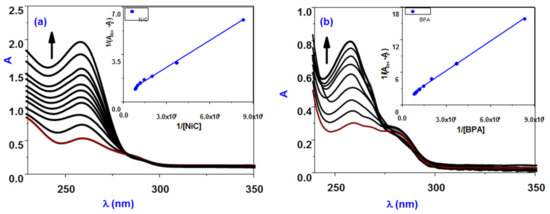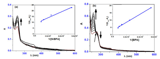 UV-absorption spectra of BSA in the absence and presence of increasing amounts of (a) NiBPA and (b) BPA in phosphate buffer (inset are Benesi–Hildebrand plots).