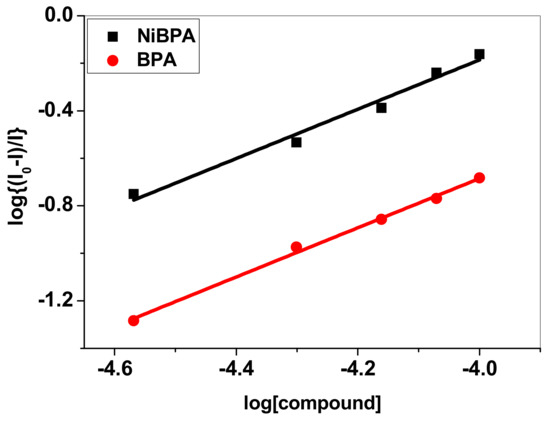 where Kbin is the compound’s BSA binding constant and n is the number of binding sites. From the log (I0 − I)/I vs. log [Q] plot (Figure 5), the binding constant (Kbin) and the number of binding sites (n) have been calculated (Table 1). Table 1 contains the evaluated values of the Kq, Kbin, and n. The estimated value of n (∼1) for BPA and NiBPA strongly supported the existence of a single binding site in BSA. The Kq and Kbin values for these compounds also indicated that NiBPA interacts with BSA more strongly than the BPA under investigation.