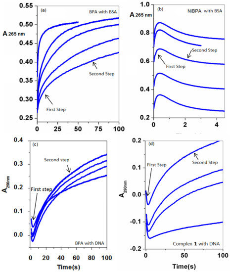 Because many medicines with lower cellular toxicity have a slow DNA dissociation rate, several factors, such as the strength of binding and the drug’s affinity for DNA, as well as the kinetic stability of DNA-drug adducts, may contribute to antitumor effectiveness. The stopped-flow technique was used to study in-vitro protein/DNA binding to BPA and propose a mechanism in order to obtain such information. The kinetic traces were recorded at 265 nm within 100 s (BPA) and 5 s (NiBPA), respectively, to capture the interaction process with BSA. The absorbance of NiBPA increased sharply in the first 1 s of the reaction with BSA and then gradually decreased over the next 5 s. In contrast, the interaction of BPA with BSA shows a distinct pattern, with a gradual increase in absorption. In the case of ct-DNA interaction, the kinetic traces were recorded at 290 nm, and both BPA and NiBPA followed a similar pattern since kinetic traces for BPA and NiBPA were collected within 100 s, covering the entire interaction process. After a sharp decrease in the first 5 s, the absorbance gradually increased over the next 100 s. Over the concentration range of BPA and NiBPA, the study of kinetic traces performed under pseudo-first-order conditions may be fitted to two kinetic phases (Figure 7) evaluated using the following Equation (3):