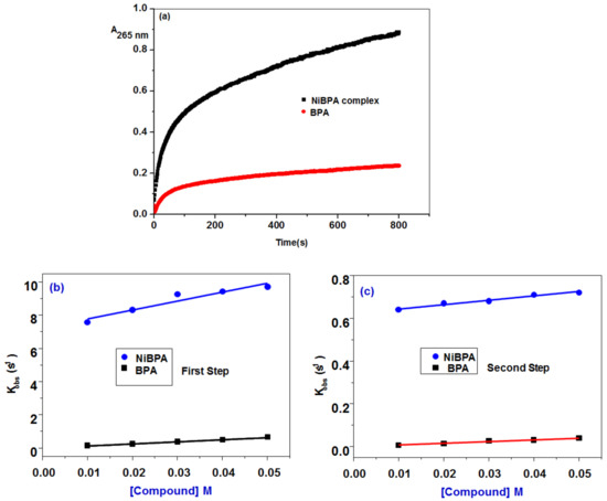 (a) Kinetic traces of BPA and NiBPA with BSA; variation of kobs vs. [BPA] and [NiBPA] for (b) the first and (c) the second interaction steps to BSA.