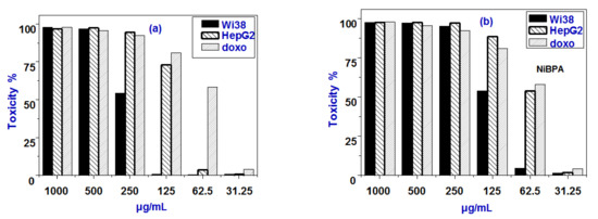 The interesting findings from BSA binding studies inspired us to use the MTT assay to test all compounds’ anticancer activity. In vitro cytotoxic activity of BPA and NiBPA were tested against human liver cancer (HepG2) and normal liver (Wi38) cell lines at various concentrations by MTT assay. The percentages of cell viability in the presence of BPA and NiBPA with different concentration levels (31.2, 62.5, 125.0, 250.0, 500.0, and 1000.0 μg/mL) are depicted in Figure 10. The cell viability was found to decrease with increasing compound concentrations for both liver cancer (HepG2) and normal (THLE2) cell lines. However, the cancer cell growth exhibited by BPA and NiBPA can be measured by the IC50 values and were found to be 100.0 ± 1.0 and 75.0 ± 0.5 μg/mL, respectively. From this data, one can conclude the following. Firstly, both complexes were cytotoxic active, but the activity was less than that for the normal drug (doxo, IC50 = 52.29 ± 1.01 μg/mL). Secondly, the Ni(II) complex NiBPA exhibits higher cytotoxicity compared to BPA. The complexation of BPA to nickel center in complex NiBPA may be the main factor for the better cytotoxicity of NiBPA. The cytotoxic selectivity of both compounds was investigated by measuring their effect on the cell viability of normal liver (Wi38) cell lines. In the case of the normal cells, the IC50 values suppressed by BPA and its Ni(II) complex NiBPA are 237.2 ± 1.3 and 120.0 ± 0.5 μg/mL, respectively. The IC50 values of the normal cells are much higher than that of the cancer cells, indicating that both compounds can be effective and selective toward cancer cells. Thus, complex NiBPA is the most active, indicating that nickel ion coordination was crucial for cytotoxicity and that complexation improved the anticancer activity. The positive charge in NiBPA due to the neutral BPA ligand may increase cytotoxicity. Additionally, these findings are in agreement with the affinities and binding constants of every compound that was studied for interaction with BSA.