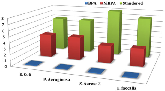 Several studies have shown that organic compound coordination with a metallic element results in significant changes in the biological activity of both the organic ligand and the metal. As a result, BPA and its nickel complex NiBPA were tested in vitro for antibacterial activity against Gram-positive (S. aureus and S epidermidis) and Gram-negative (P. mirabilis and E. coli) bacteria. Figure 10 depicts the antibacterial function of BPA and NiBPA as the diameter of the growth-inhibition region in millimeters. Table 3 shows the minimum inhibitory concentration (MIC) and minimum bactericidal concentration (MBC) of complexes required to inhibit bacterial growth. The MBC is identified by determining the lowest concentration of antibacterial agents that reduces the viability of the initial bacterial inoculum by 99.9%. The MIC or MBC strain was chosen based on the value agreed upon on two or more occasions. The antibiotic tobramycin (TOB) was used to control the situation. The inhibition zone, as well as the MIC and MBC data, leads to the following conclusions. To begin, NiBPA exhibited strong antibacterial activity, and its antibacterial activity was much greater than that of BPA, but it was less than that of the standard drug (TOB). Second, NiBPA demonstrated greater antimicrobial activity against Gram-negative bacteria than Gram-positive bacteria. This is explained by the metal ion’s polarity and cationic charge, as NiBPA has a cationic property with two positive charges. Gram-negative bacteria were more sensitive to NiBPA than Gram-positive bacteria due to differences in cell surface characteristics; Gram-negative bacteria had a higher negative charge on their cell surface than Gram-positive bacteria [56,57]. The interaction between Gram-negative bacteria and NiBPA was stronger than that of Gram-positive bacteria due to the higher negative charge on the cell surface, despite the presence of an outer membrane in Gram-negative bacteria (see Figure 11).