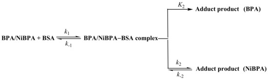 A reversible reaction with a coordination affinity of 0.69 M−1 for NiBPA was detected in the second reaction step, but an irreversible reaction with a K2 = 0.69 M−1 with BPA was observed. The second phase is primarily concerned with the BSA condensation process, in addition to the electrostatic interaction. As shown in Figure 8, the irreversibility of the second reaction step with BPA (k−2 ≈ 0) suggests that the newly formed BPA-BSA complex is kinetically more stable in solution than NiBPA-BSA.