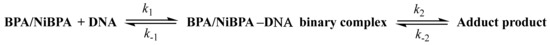 The kinetics of protein and DNA binding was measured using an Applied KinetAsyst SF-61DX2 stopped-flow instrument. At 25 °C, equal volumes of compounds against protein and DNA solutions were rapidly mixed in the stopped-flow instrument. The binding reactions were studied using a 10-fold excess of the ligand BPA and NiBPA under pseudo-first-order conditions. For each experimental condition, all recorded rate constants were taken into account, from which the mean values of at least three independent kinetic runs were calculated.
