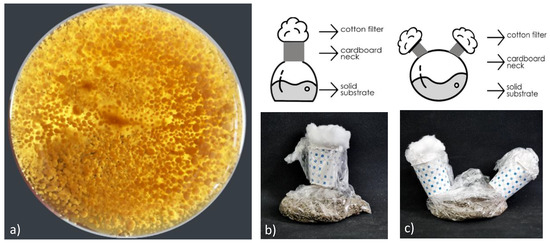 G. lucidum, one of the most studied species of white-rot Basidiomycetes, was used for the pilot tests of this study. The fungus was maintained on malt extract agar (MEA) slants at 4 °C. In a different ongoing study by the authors, inoculum production was optimized for pH, time, and an initial amount of inoculum. Accordingly, inoculum production was prepared using malt extract broth (MEB) (pH 5) by incubation at 28 °C and 200 rpm for 11 days. After incubation, the inoculum (Figure 1a) was used as 1 mL/5 g of dry substrate.