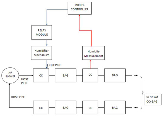 The humidifier mechanism consists of an air blower with a 75 mm air outlet and a DC motor of about 60 W, a sterilized humidifier with a 4 L water capacity, and pipes. The working principle of the humidifier is simply that an air blower is connected to the tank’s top level, forcing moisture to circulate inside the colonization bags. This process is controlled with the microcontroller. Figure 3 and Figure 4 illustrate a simplified block diagram of the electrical and mechanical system of the MCB and the humidifier.
