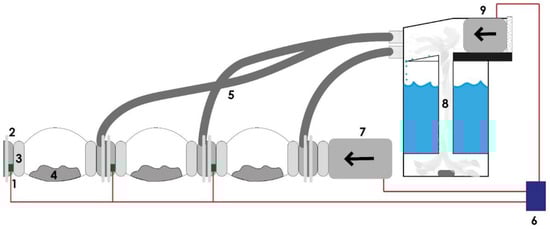 The simplified electrical and mechanical system of the MCB and the humidifier: (1) humidity/temperature sensor, (2) CC, (3) air filter, (4) solid substrate, (5) hose pipe, (6) Arduino, (7) 100 W air blower, (8) vapor chamber, (9) 50 W air blower.