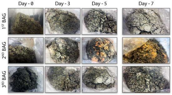 In the three-bag experiment, the second bag in the middle was kept in a non-sterile area and added to the system to control the spread of contamination between modular systems. Three observations were made on the 3rd, 5th, and 7th days (Figure 5). Visual inspection shows apparent white hyphae (G. lucidum) colonizing the first and the third bags without any contamination; however, an unknown microorganism (orange-pink color) grew predominantly in the non-sterile bag (middle unit). The contamination in the second bag did not spread to other bags, indicating that the modularity of the filtration system and the developed MCB system were successful. If the filtration system had been inadequate and the contamination had spread to bags one and three, it would have also inhibited the mycelial production of G. lucidum. On the other hand, when Figure 5 is examined, the development of G. lucidum in bags one and three on the 5th and 7th days, and the contamination in the 2nd bag, can be clearly distinguished in terms of mycelium production and color. This shows that the filtration between modules successfully prevented the spread of contamination as intended (Figure 6).