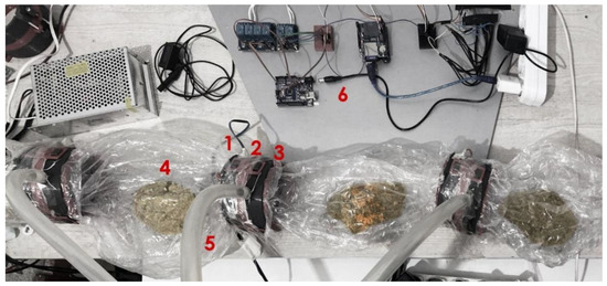 MCB contamination control experiment setup: 1, humidity/temperature sensor; 2, CC; 3, air filter; 4, solid substrate; 5, hose pipe; 6, Arduino).