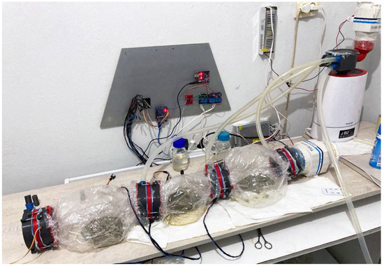 In order to see the effect of the system designed for biomass production, three candy bags were prepared for the MCB. One candy bag and one traditional bag were prepared as a control group. Both bags were filled with 200 g of zeolite support material and were enriched with a liquid solution containing mineral salts and nutrients (Table 2). Zeolite is an inert support material, consisting of SiO4 and/or AlO4, and is ideal for mycelium production in solid-state fermentation, thanks to the large voids in its structure [17]. When zeolite reaches the ideal humidity with a liquid solution containing nutrients, it has a structure that triggers mycelium production and keeps the pH value of the microorganism constant [18]. Therefore, this solution is also used as a moistening liquid to trigger microorganism growth.