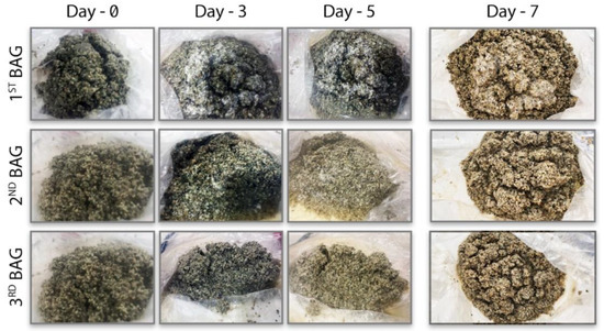 According to the results, the conditions provided for mycelium production during the 7 days showed a positive effect. The provided air supply and humidification were shown to provide early microbial activation. In addition, the fact that mixing can be achieved manually accelerates the growth of microorganisms that are activated early. However, during the experiment, it was observed that water accumulation occurred in the second bag. This negative situation can prevent mycelial production in solid-state fermentation. For this reason, as a result of the obtained biomass, the production in the 2nd bag was lower than in the other bags (Figure 8).