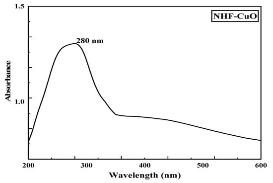Nano Herboformulation (NHF) was prepared as per the protocol described above, where the capacity of phytochemical in NHF was investigated and found to be 305.51 µg/mg with a loading efficiency of around 61.58% in Figure 2. UV-Vis spectroscopy is a widely recognized methodology for studying powder-suspended nanoparticles [28]. At room temperature, the UV-Visible absorption spectra of the green synthesized nanoformulations are presented in Figure 3. As a result of surface plasmon resonance (SPR), the nanoformulations show high absorption below 350 nm and a well-defined absorbance peak at around 280 nm. Copper oxide nanoparticles synthesized from various plant precursors also showed a similar result [29].