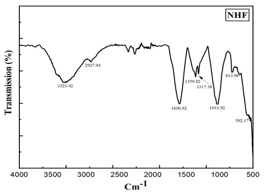In FTIR analysis, we were able to classify nano-sized substances by the composition of nano-herboformulation. Figure 5 shows FTIR spectra of nano herboformulation. Nano herboformulation FTIR spectra show Cu-O vibrations at frequencies less than 700 cm−1 [31]. Small peaks (592.17 cm−1), O-H stretching vibration (3321.42 cm−1), frequency-independent (2927.94 cm−1), vibration resulting from C=C stretching (1600.92 cm−1), O-H deformation vibration (1359.82 cm−1), and bands corresponding to the characteristic frequency of inorganic ions are observed in CuO NPs [32]. Alkane, aromatic, ketone compounds, carboxylic acids, and aromatic nitro compounds are attributed to C-H deformation vibration (1317.38 cm−1) and CH3 rocking vibration (1031.92 cm−1). Deflation of the capping caused a comparatively high peak in CuO NPs due to C-O stretching [33].