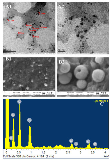 Electron micrographs of Nano Herboformulation. (A1,A2) TEM analysis. (B1,B2) SEM analysis, (C) EDX analysis of Nano Herboformulation, where O—48.41%, Cl—5.77%, K—8.29%, Cu—37.23%.