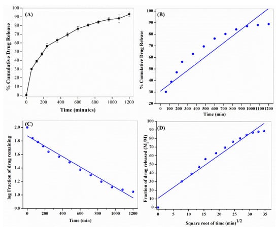 (A) Phytochemical release study from NHF. Kinetics of study phytochemical release study from NHF (B) Zero-Order, (C) First-Order & (D) Korsmeyer–Peppas models.