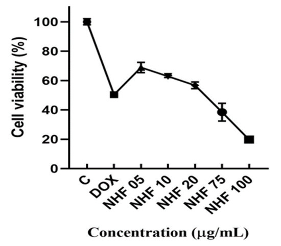 In Dulbecco’s Modified Eagles Medium, H9C2 myocardial cells were purchased from National Centre for Cell Sciences, Pune, India. Under humidified 5% CO2 atmosphere at 37 °C, the cells at density 1 × 104 counts were grown in 10% FBS, 1% penicillin-streptomycin antibiotic solution. MTT assay was used to assess cell viability. To reduce toxicity, we stimulated H9C2 myocardial cells with doxorubicin. NHF at different concentrations was used to reduce the toxicity of myocardial cells. A 96-well cell culture plate was filled with NHF with doxorubicin (5, 10, 20, 30, 40, and 50 µg/mL) for 30 min. The cells were incubated with various NHF Cells concentrations and then set at 37 °C in the dark for 4 h with MTT. After discarding the supernatant, 100 mL DMSO was added to the plates, dissolving the formazan crystals caused by MTT’s interaction with the live cells. Microplate readers were used to measuring the absorbance at 570 nm.