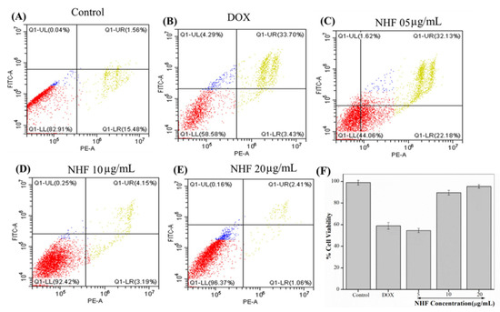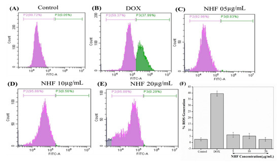 Monitoring intracellular ROS was accomplished using dichloro-dihydro-fluorescein diacetate fluorescent probes. After 24 h of incubation in 6-well plates maintained at 1 × 106 counts, cells were treated with NHF with doxorubicin (5, 10, or 20 µg/mL) and incubated for another 24 h. Incubation with DCFH-DA at 37 °C for about 30 min, followed by rinsing with fresh DMEM, was followed by analysis using a flow cytometer after cells were rinsed three times with fresh DMEM. Results were expressed as fold changes in fluorescence intensity based on a minimum of 10,000 events per sample. A comparison was made between the results and the control value.