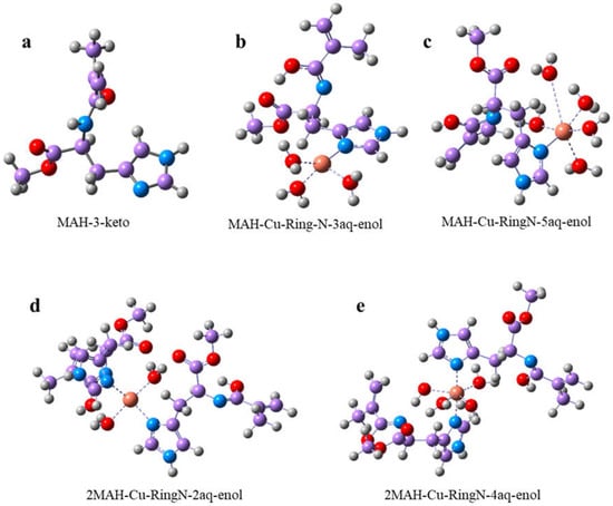 From the calculation results of the four-fold and six-fold MAH-Cu(II) complexes, the most stable structure was the enol form of the complexes in which copper(II) was bonded with the nitrogen atom of the histidine ring, including three and five water molecules, respectively (Figure 1b,c). In this most stable structure, Cu(II) coordinated with MAH and water in its distorted square planar and distorted trigonal biplanar structures for four-fold and six-fold coordination, respectively. In the complexation with both N and O atoms of MAH and Cu(II), square planar structures were found for four-fold with two water molecules, as well as square pyramid or trigonal bipyramidal structures for five-fold with three water molecules (Tables S2–S5 in Supplementary Data).