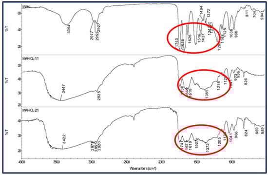 FTIR spectra of MAH monomer (upper), MAH-Cu(II) (middle), and 2MAH-Cu(II) (bottom) complexes. Fingerprint area: red circles.