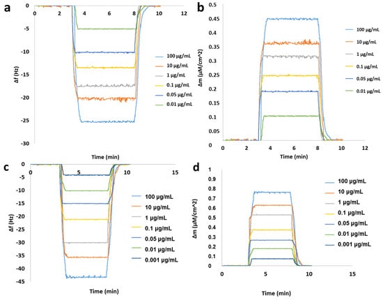 Here, Δm denotes the mass change, and Δf denotes the frequency shift. The mass sensitivity constant (CQcm) equals to 17.7 ng/cm2.Hz for 5 MHz AT cut of QCM sensor.