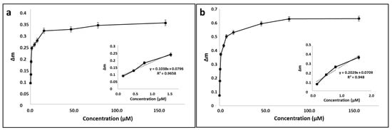 Here, Δmmax is the maximum QCM mass change; Δm is the equilibrium QCM mass change; c is the analyte concentration (nM); KA (1/nM) is the association constant; KD (nM) is the dissociation constant; and 1/n refers to the Freundlich surface heterogeneity index.