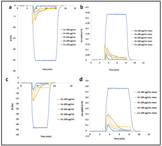 QCM sensor time versus oscillation frequency (a); mass changes (b) for Cu(II)-MIP1 time versus oscillation frequency (c); and mass changes (d) for Cu(II)-MIP2 QCM nanosensor.