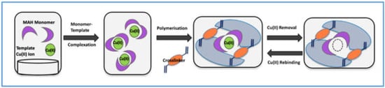 Prior to Cu(II)-MIP nanoparticle preparation, the Cu(II) ions were used as a template to form a complex with the MAH monomer, the functional monomer. The polymerization step took place in the presence of a cross-linker (EGDMA), a basic monomer (HEMA), and a functional monomer template complex (MAH-Cu(II)). After polymerization, the template Cu(II) ions were removed. In this way, Cu(II) ions left their places in the imprinted cavities (Scheme 1) in structure and shape memory.