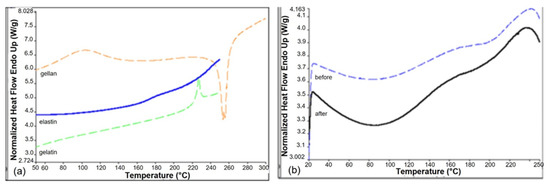 Figure 5a). Gellan thermogram showed a first endothermic event between 50 and 130 °C, due to the evaporation of residual water, and a second exothermic event at 260 °C, due to the polysaccharide degradation. Elastin thermogram showed a variation of the baseline, between 160 and 190 °C, attributable to the glass transition event. Gelatin showed a glass transition event at 220 °C, superimposed to an endothermic event, due to the denaturation of residual triple helix.