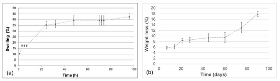 The weight loss of the scaffolds during degradation was determined by measuring changes in dry weight after specific incubation times. All experiments were performed in triplicate; the results are the mean (±SE) of three determinations carried out by keeping the samples in separate containers.