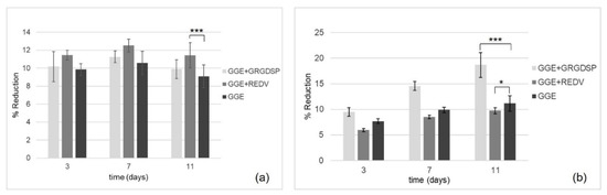 Figure 8b), the highest percentage of reduction was observed for the GRGDSP-modified samples.