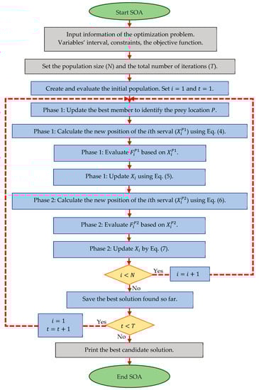 By updating all servals based on the first and second phases of SOA, the first iteration of the algorithm is completed. Then, based on the new positions of the servals and the new values obtained for the objective function, the algorithm enters the next iteration. The operation of updating the positions of servals is repeated until the last iteration of the algorithm based on Equations (4)–(7). After the complete implementation of SOA, the best candidate solution obtained during the algorithm’s execution is introduced as the solution to the problem. The SOA implementation process is presented in the form of a flowchart in Figure 1, and its pseudo code is presented in Algorithm 1.