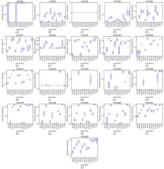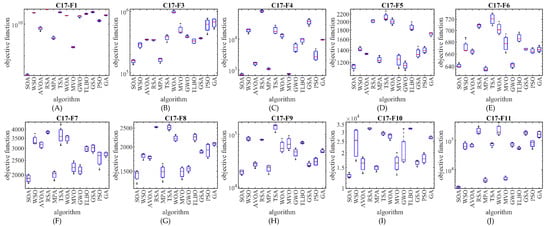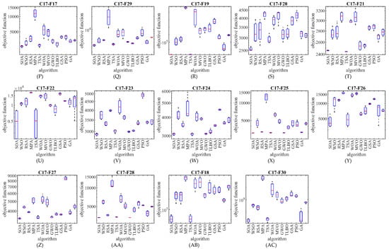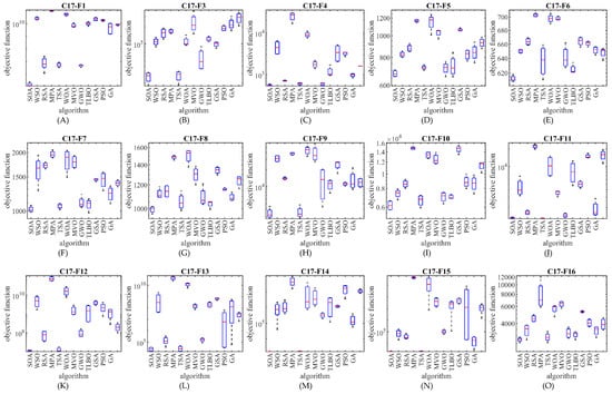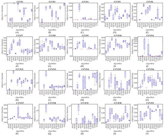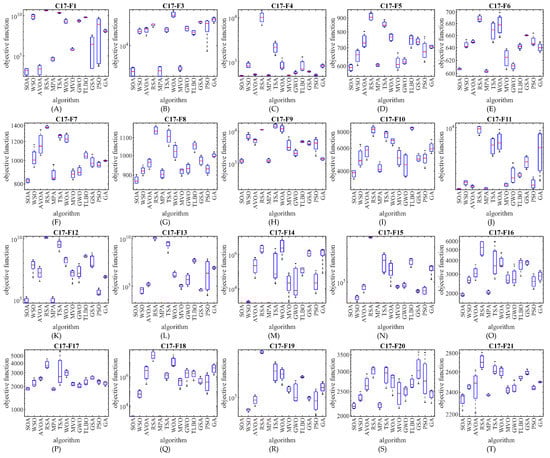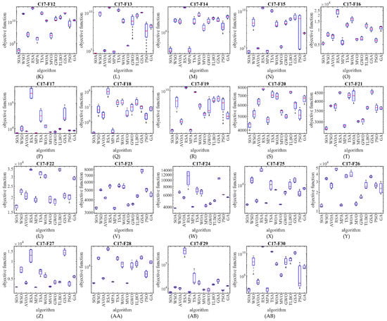 Boxplot diagram of SOA and competitor algorithms performances on the CEC 2017 test suite (for the dimension ).