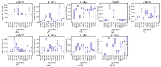What can be concluded from the comparison of simulation results is that for the dimension , SOA is the best optimizer in handling the functions C17-F3, C17-F6, C17-F7, C17-F10, C17-F19 to C17-F24, C17-F26 to C17-F30. For the dimension , SOA is the best optimizer in handling the functions C17-F1, C17-F3 to C17-F5, C17-F7 to C17-F11, C17-F14 to C17-F16, C17-F20, C17-F21, C17-F23, C17-F26, C17-F27, C17-F29, and C17-F30. For the dimension , SOA is the best optimizer in handling the functions C17-F1, C17-F3 to C17-F10, C17-F12 to C17-F20, C17-F22, C17-F23, and C17-F25, to C17-F30. For the dimension , SOA is the best optimizer in handling the functions C17-F1, C17-F3 to C17-F5, C17-F7 to C17-F13, C17-F15, C17-F16, C17-F18, to C17-F22, C17-F24, to C17-F26, C17-F29, and C17-F30.
