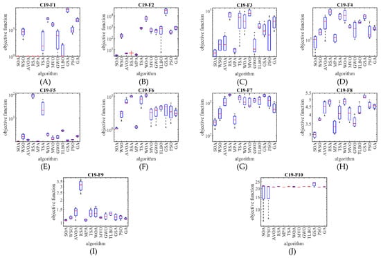 Boxplot diagram of SOA and competitor algorithms performances on the CEC 2019 test suite.