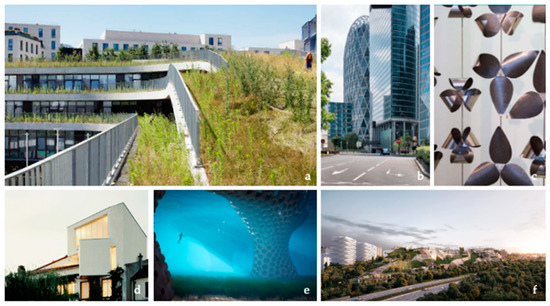 Built bioinspired buildings located in France (a) Ecole des sciences et de la biodiversité, Boulogne-Billancourt, 2015 © ChartierDalix – Takuji Shimmura, (b) D2 tower © Pierre Elie de Pibrac, (c) © ArtBuild, (d) © In Situ Architecture, (e) © Rougerie+Tangram, (f) © Tryptique Architecture.