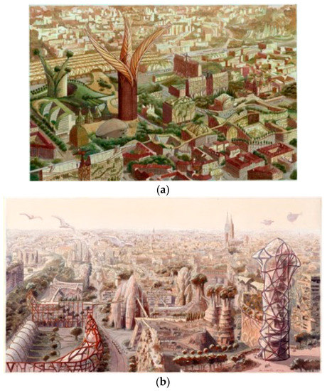 Despite these debates within the profession, biomimicry highly stimulates the imagination of architects and artists. For instance, the belgian architect Luc Schuiten designed a series of drawings call the ‘Vegetal Cities’, which embodied the concept of biomimicry [86]. Metropolises are imagined as vast orchards, which created symbiotic interactions between humans, fauna, flora, and all the living systems. The concept of archiborescence developed by the architect was applied to imaginary cities and existing metropolises, such as the cities of Lyon and Strasbourg (Figure 4), Bruxelles, Sao Paulo, Venise, Shanghaï, etc. [86]. This work is in line with the ongoing developments of nature-based solutions, regenerative and biophilic cities. The French architecture studio of Vincent Callebaut also developed futurist utopia of bioinspired cities and buildings. His work combined the concepts of ecosystem services, high technologies, and biophilia [87].
