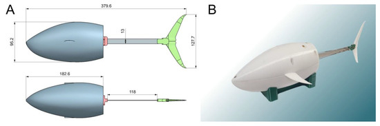 The robotic fish. (A) Dimensional drawing; (B) working prototype.