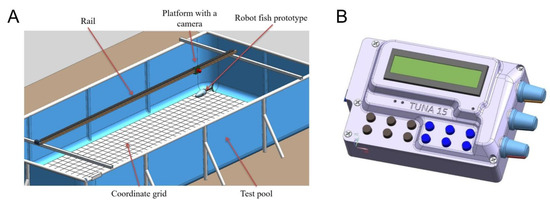Fish swimming experiments. (A) Experimental setup to monitor characteristics (speed, direction, mode of movement) of the robotic fish. (B) Control panel of the robotic fish.
